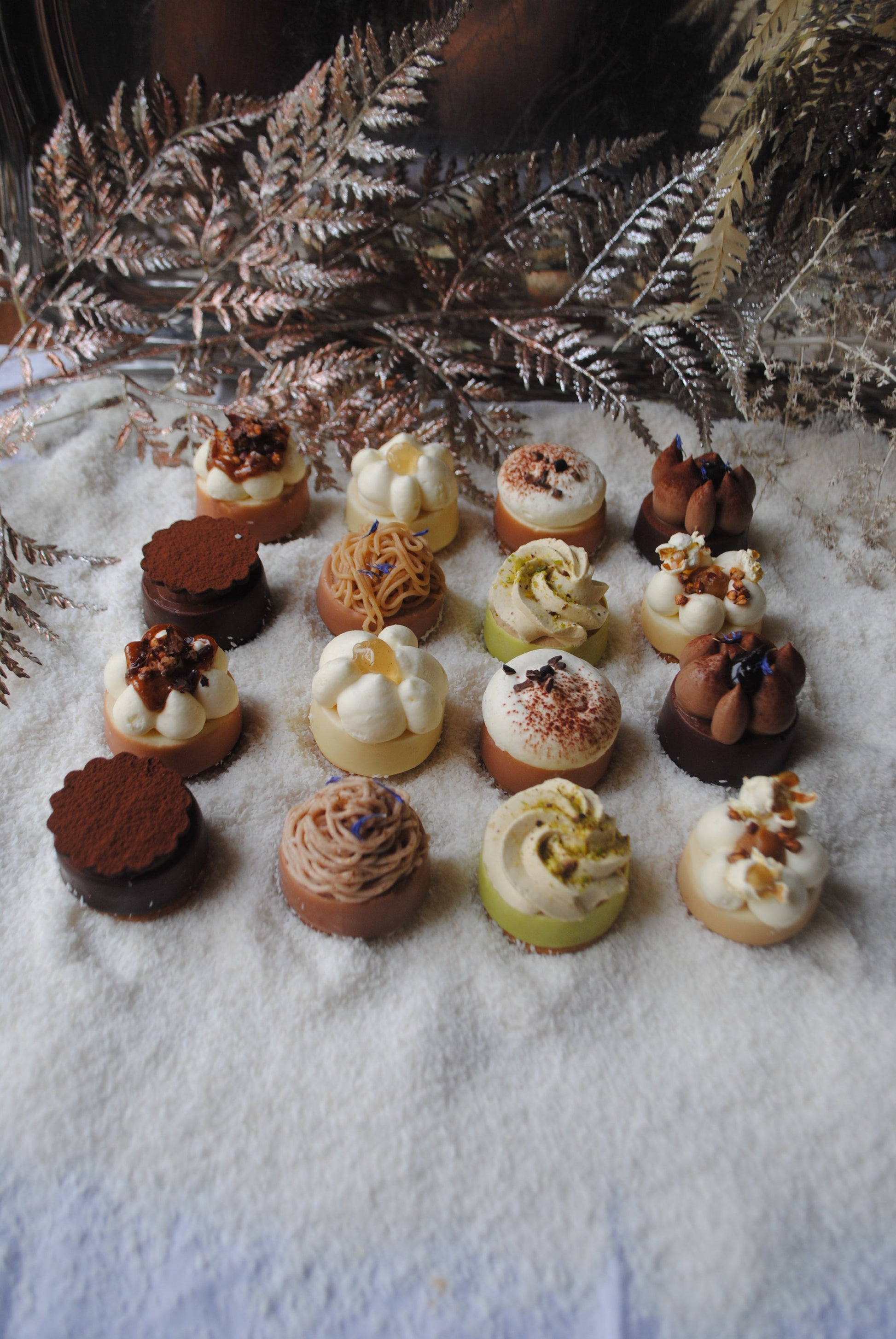 Praliné noisette, vanille, café, chocolat, chocolat praliné sésame noir( vegan), marron, pistache, pop corn caramel au beurre salé.